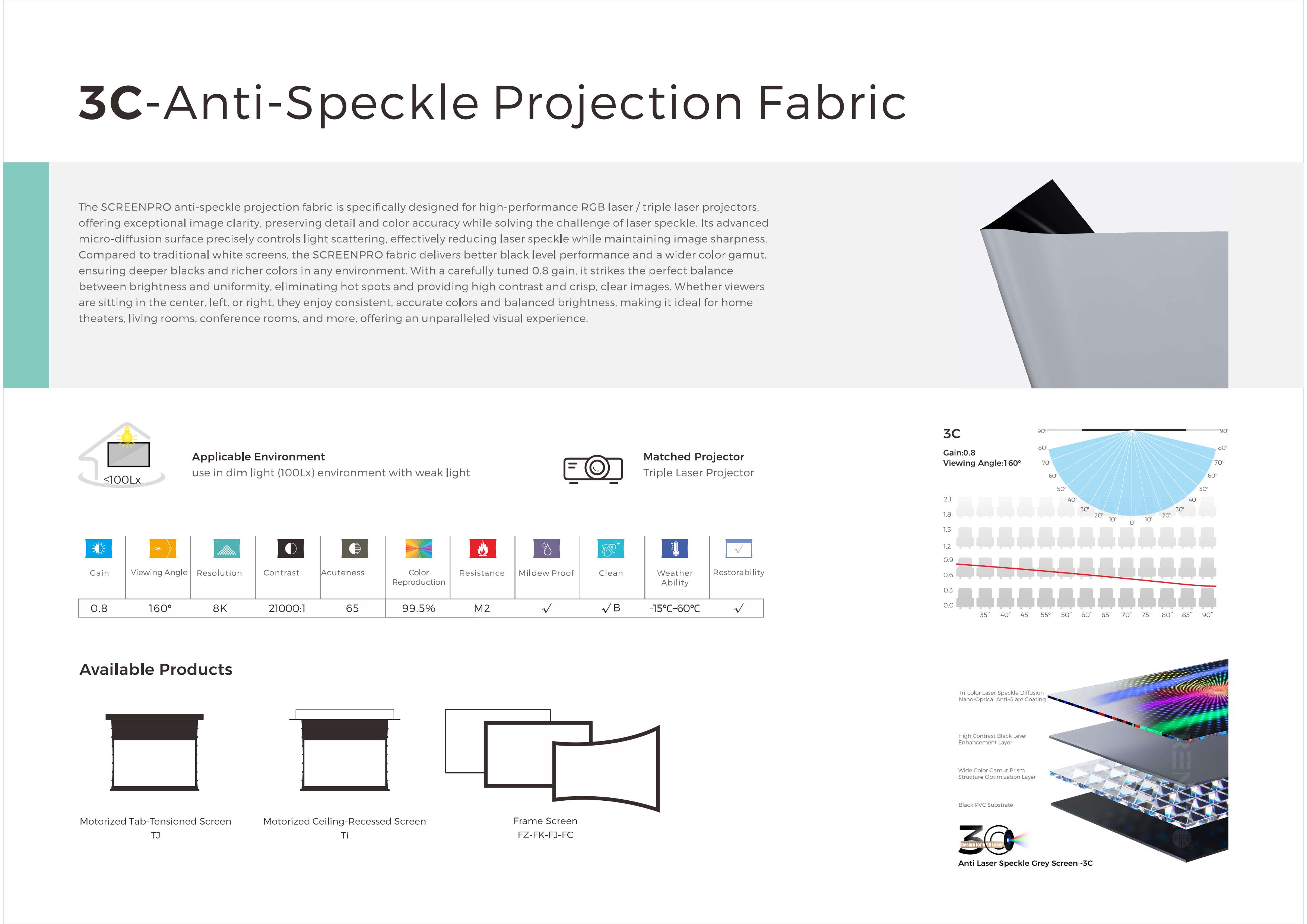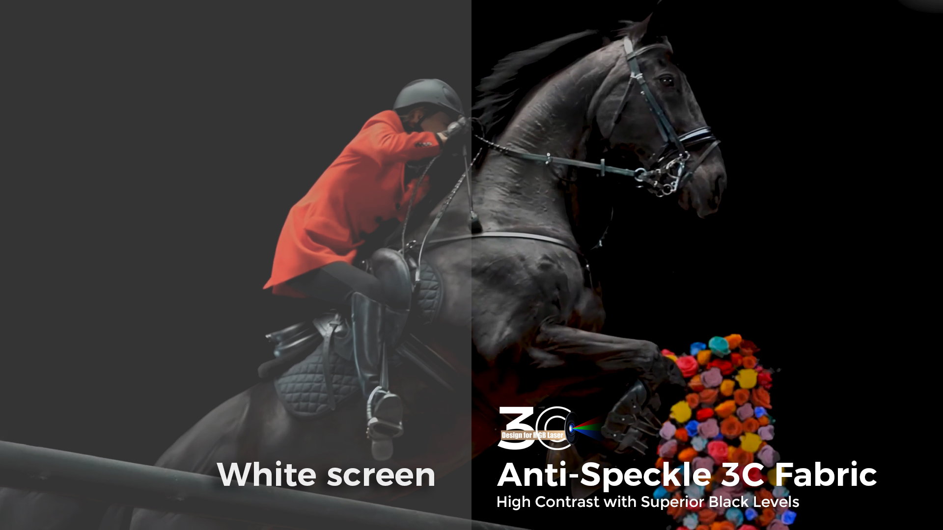 The SCRENPRO 3C febric micre srectured urfece effectihey diues coherenl lae lisht. reurcing thimmerig or grainy pellerns and enhancing overall clarity. The esuls inricher colors, cleaner gradients, and more stable visuals, especially important when using triple-laser or ultra-short-throw laser projectors. The fobric helbs evenly disperse the laser light, reducing hotspots orlocalied overexposure caused by concentrated light. This is particularly evident in dark scenes where blacklevel oreclearer, colors are purer, and the overall image is more stable.